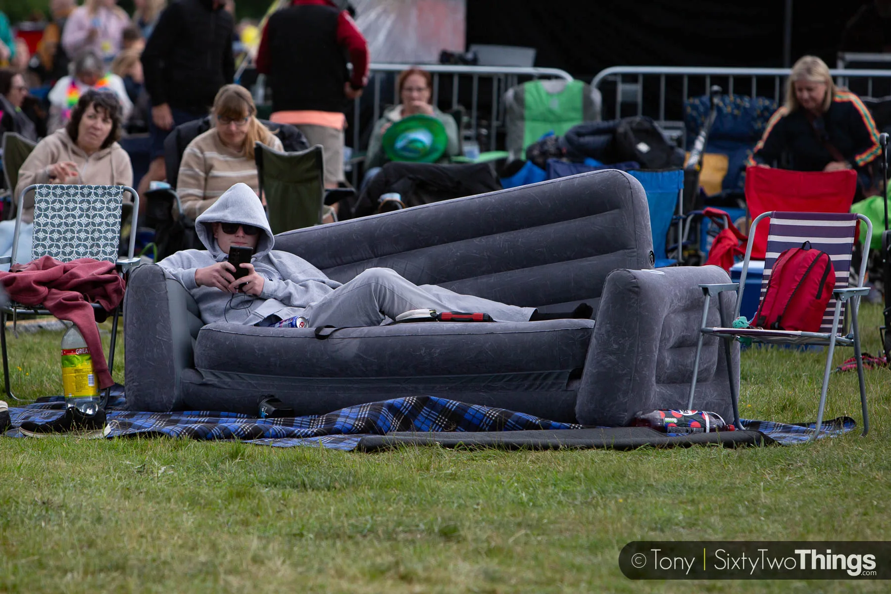 Wandering around the arena of this family orientated event, there were festival trolleys everywhere that had been dragged from the deepest depths of the shed, mostly dusted down and loaded with picnic gear and waterproofs. Some even had children on board – hopefully not having spent the winter in the shed too. Folding chairs were formed in semi circles like covered wagons as picnic rugs were planted in the middle and Dads were dispatched to the bar for drinks.